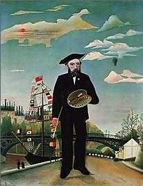 本作は1889年に開催されたパリ万国博覧会の情景を背景に、まだ税関吏として働いていたルソーが画家としての己の46歳の姿を描いた自画像作品で、ルソーが死の間際まで手放さず、加筆し続けた作品でもある。